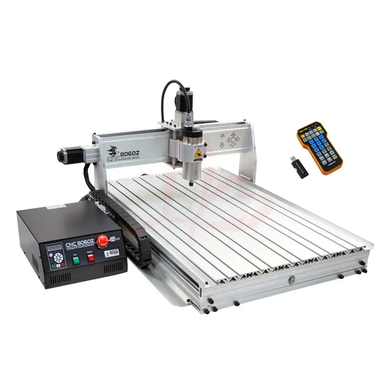 [32907876683] 1500W spindle 3axis CNC 8060 ER11 collet USB port Router Engraving Drilling and Milling Machine Introduction The CNC router is suitble for Industry, Technology Research, Advertising Design, Arts Creation, Teaching, Student Project and Hobby Purposes. The cnc router is designed for large area engraving work such as Industrial or Hobby Prototype Building, Building Model Making, PCB, Advertising Signs, Artwork, Crafts, Aircraft Models, RC Model parts, etc. So, you can do engraving work at office or home. Model and Technical Parameters MODEL 8060Z-1.5KW Attribute 3axis Axis 3axis Interface USB port Limit switch Yes Tool auto-checking Spindle Motor: 1500W Weigh 87 Machine Dimensions: 1130X890X610mm Rack material: 6061-T5 extruded aluminum alloy Engraving area: 790X580mm Z-Axis Stroke: 105mm, Engraving depth depends on the length of the tool edge Acceptable material thickness ≤ 120mm Rail type: Chromeplate shaft + Linear Bearings, Surface hardening 61HRC Type of screw: Ball screw (XZ axis 1605, Y axis 2005) Spindle motor: air cooled spindle , 1500W , 0-24000r/min Collet type: ER11,1/8"(3.175mm and 6mm) Collet Stepper motor and drive: 60BYGH86-4.0A, Each axis independently driven Maximum operating speed: 4000mm/min (Engraving speed: 300-3000mm/min) Repeat positioning Accuracy: 0.03mm Software Compatability: Mach3/Emc2/Kcam, (Type3,Wentai, ArtCAM, coppercam) Command code: G code/.nc/.ncc/.tab/.txt Rotation Axis (4th Axis) Description: Center height: H = 60mm Maximum turning diameter: ≤ 110mm Deceleration ratio: 4:1 Stepper motor: NEMA23BHH76-3A Weight: 5KG Packing list: 1× Engraving machine 1× Control box 1× Power cable 1× USB port cable 1× Tool package 4× clamps 1× tool auto-checking instrument 1× water pump 1× CD of manual and software MACH3 (if not get, may be lost in customs, please contact us)